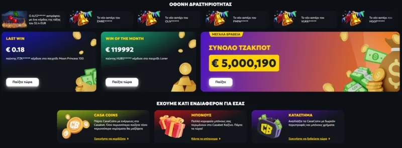 Στο CasaBet Casino προσφέρουμε ποικίλα μπόνους για νέους και παλιούς παίκτες. Μπορείτε να βρείτε εβδομαδιαίες προσφορές, όπως επιστροφή χρημάτων ή reload μπόνους, που δίνουν επιπλέον ευκαιρίες για παιχνίδι.