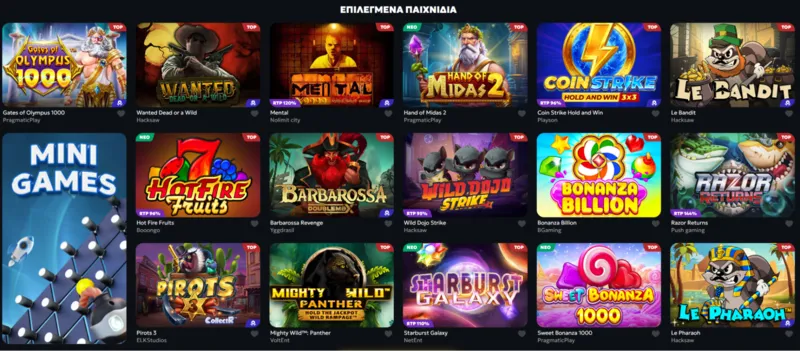 Προσφέρουμε μια ευρεία γκάμα παιχνιδιών: από φρουτάκια και επιτραπέζια έως ζωντανά τραπέζια και αθλητικά στοιχήματα. Η πλατφόρμα μας λειτουργεί σε instant-play, ώστε να παίζετε απευθείας από τον υπολογιστή ή το κινητό σας χωρίς να εγκαθιστάτε επιπλέον λογισμικό.